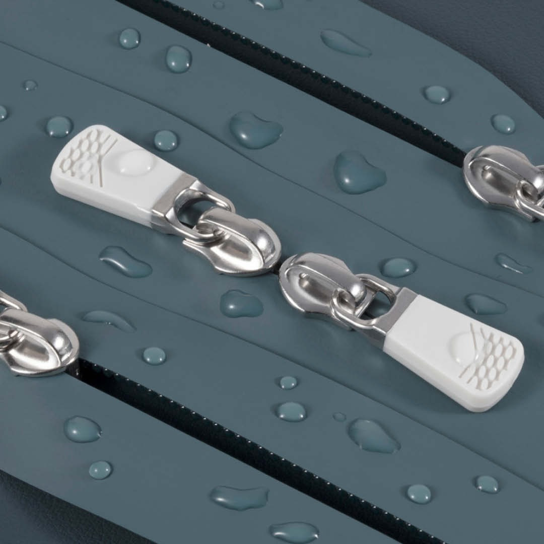 Una zip idrorepellente con nastro laminato in poliuretano, disponibile in tre versioni: lucida (con pellicola trasparente lucida), opaca (pellicola colorata) e opaca (pellicola trasparente opaca). Questa versione aggiornata migliora lo scorrimento, la praticità e le prestazioni ambientali. Le zip a spirale AquaGuard® NATULON® utilizzano di serie nastro in poliestere riciclato.